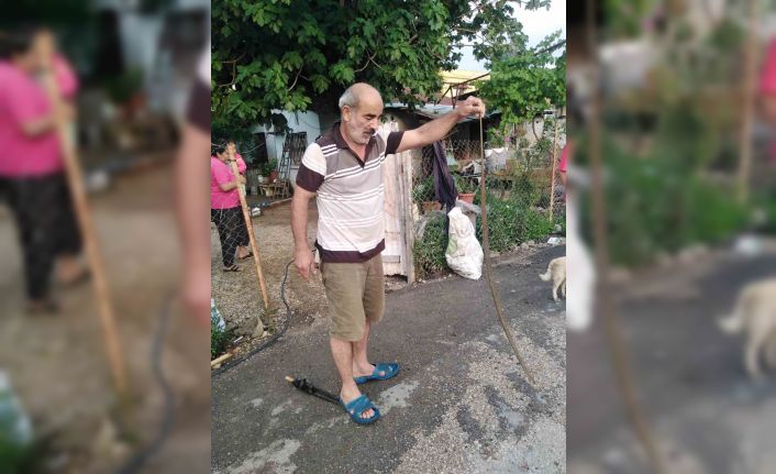 Adana Kozan’da bir kişi, evine giren yılanı eliyle yakalayıp doğaya bıraktı.