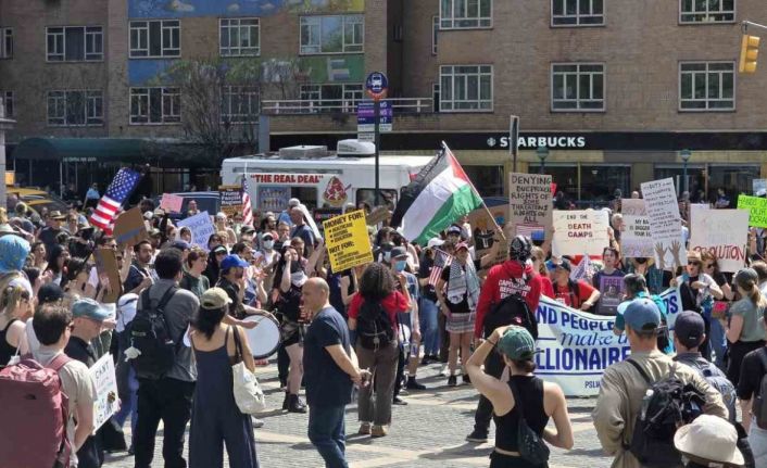 ABD’de Başkan Donald Trump ve yönetimi politikaları nedeniyle tepki görüyor. Trump ve Hükümet Verimliliği Departmanı’nın (DOGE) başındaki Elon Musk’ın göçmen politikalarına, federal çalışanların işten çıkarılmasına ve öğrencilere yönelik baskılarına tepki gösteren binlerce kişi New York şehrinde bir araya geldi. Bryant Park’tan başlayan ve Central Park Columbus Meydanı’nda sona eren protesto gösterisinde "Trump Kral Değil", "Elon Musk İstifa", "Özgür Filistin" gibi sloganlar atan binlerce kişi gözaltına alınan Mahmoud Khalil ve Rümeysa Öztürk için de özgürlük çağrısı yaptı. "Rümeysa’ya Özgürlük", "Mahmoud Khalil’e Özgürlük" yazılı pankartlar taşıyan protestocular, öğrencilerin serbest bırakılmasını istedi.