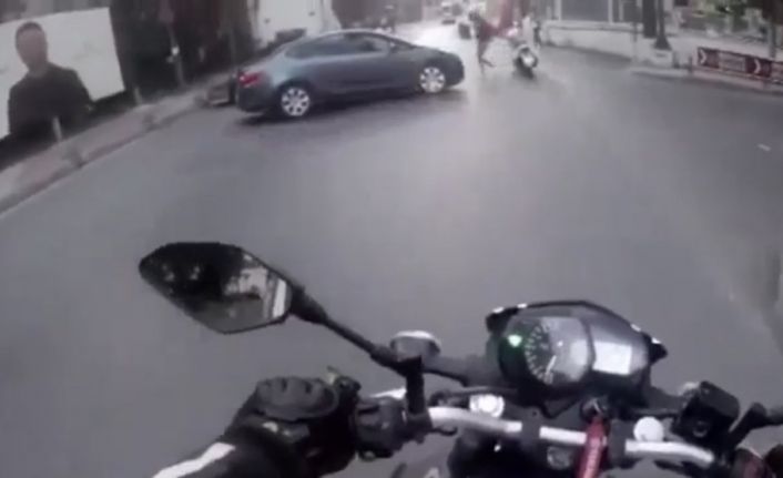 Kağıthane’de motosiklet sürücüsü park yerinden çıkmaya çalışan otomobile çarpmaktan son anda kurtuldu. Duruma sinirlenen motosiklet sürücüsü, arabayı tekmeleyerek, dikiz aynasını parçaladı. O anlarda başka bir sürücü tarafından saniye saniye görüntülendi.