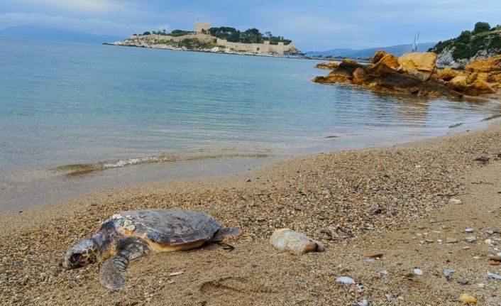 Aydın’ın Kuşadası ilçesinde arkeolojik sit alanı olan Yılancı Burnu’nda karaya vurmuş bir deniz kaplumbağası bulundu.