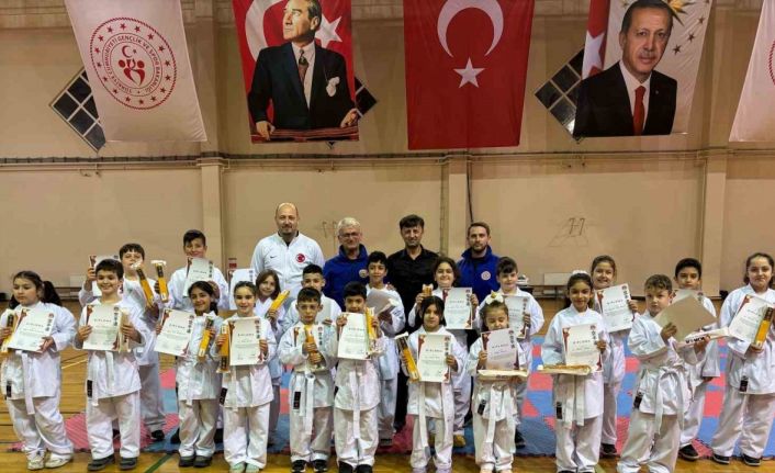 Dört aylık yoğun antrenman sürecinin ardından kuşak sınavına katılan 60 küçük karateci, hünerlerini sergileyerek izleyenlerin takdirini topladı.