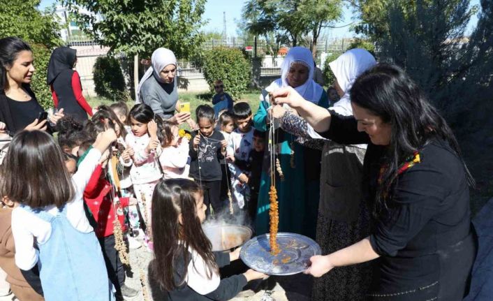 Sosyal Hizmetler Dairesi Başkanlığı bünyesinde faaliyetlerini yürüten 450 Evler’deki Zarokistan Kreş ve Gündüz Bakım Evinde eğitim gören çocuklar için bağ bozumu ve bulamaç etkinliği gerçekleştirdi. Kreş bahçesindeki etkinlikte çocuklar, ipe dizilen cevizleri veliler ve eğitmenlerin desteğiyle kazanda pişirilen bulamaca batırarak cevizli sucuk yaptı, ardından bulamacı pestil için çarşaflara dökerek dağıttı. Çocuklar, daha sonra cevizli sucukları hazırlanan ipe astı, pestil çarşaflarını da güneşe bıraktı.