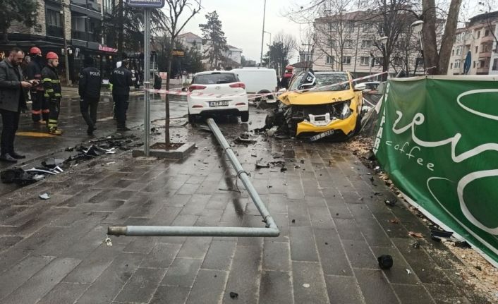 Kaza sabah saatlerinde Düzce merkez Kültür Mahallesi Namık Kemal Sokak girişinde meydana geldi. Edinilen bilgilere göre Ufuk A.’nın kullandığı 16 FP 952 plakalı otomobil, Mehmet Akif Caddesi’ne bağlanan kavşakta şehir merkezi istikametine gitmekte olan Tuncay K.’nin idaresinde ki 81 T 1249 plakalı ticari taksiye çarptılar. Çarpmanın etkisi ile araçlar yoldan çıkarak kaldırıma savruldular. Kaldırımda bulunan elektrik direğini de deviren otomobillerde bulunan sürücüler Ufuk A. ve Tuncay K. ile Mehmet A. yaralandı.