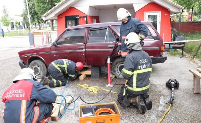 Düzce Belediyesi İtfaiye Müdürlüğü, hizmet içi eğitim çalışmalarında itfaiye personeline trafik kazalarında müdahale konularında uygulamalı eğitim verdi.