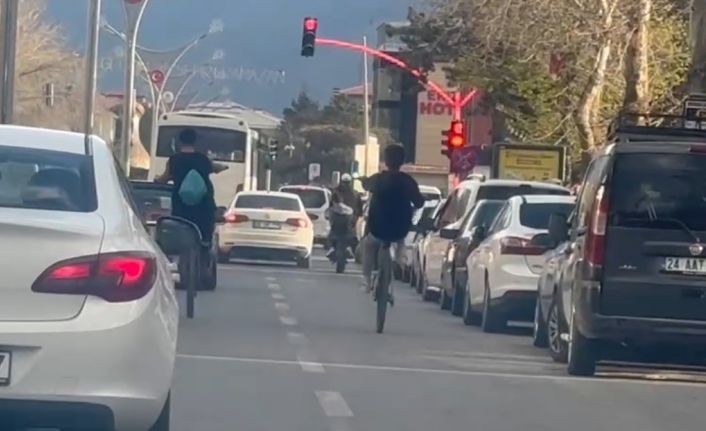 Erzincan’da bisikletle araçların arasında ilerlerken akrobasi hareketler yaparak tek teker üzerine giden gençler trafiği tehlikeye sokuyor.