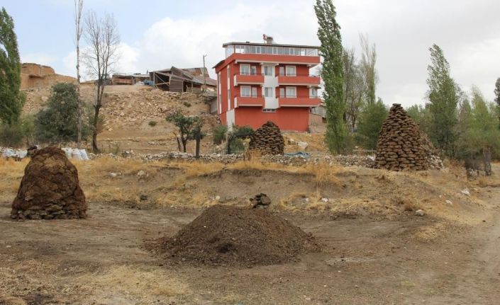 Erzincan’da köyde yaşayan vatandaşlar kış öncesi yakacak için tezekleri hazır etti.