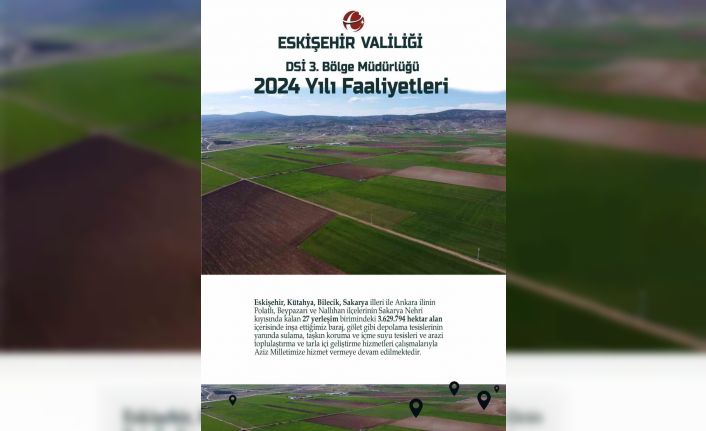 Eskişehir Valiliği resmi sosyal medya hesabından yapılan paylaşımda, Devlet Su İşleri (DSİ) 3’üncü Bölge Müdürlüğü’nün 2024 yılında 27 yerleşim birimindeki 3 milyon 629 bin 794 hektar alan içerisinde çalışmalar yaptığı aktarıldı.