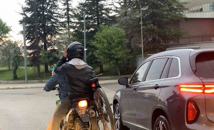 Eskişehir Odunpazarı’nda iki kişinin motosiklet yolculuğu yüreklileri ağıza getirdi. Trafiği tehlikeye sokan iki şahıs hem kendi canlarını hem de diğer sürücülerin canlarını tehlikeye attı. Motosiklet sürücüsünün arkasındaki yolcu, trafiği hiçe sayarak yanında bisiklet taşıdı. Aynı zamanda plakasız motosiklet ile yolculuk yapan iki şahıs, çevredeki sürücülerin hayret dolu bakışları arasında gözden kayboldu.