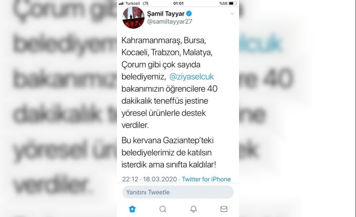 Milletvekil Tayar, yaptığı paylaşımında, "Kahramanmaraş, Bursa, Kocaeli, Trabzon, Malatya, Çorum gibi çok sayıda belediyemiz, Ziya Selçuk bakanımızın öğrencilere 40 dakikalık teneffüs jestine yöresel ürünlerle destek verdiler. Bu kervana Gaziantep’teki belediyelerimiz de katılsın isterdik ama sınıfta kaldılar" ifadelerini kullandı.