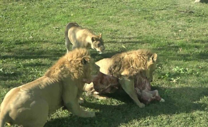 Bursa Hayvanat Bahçesi’ndeki hayvanların hareketlenmesi için farklı yöntemlerle yapılan besleme egzersizleri nefesleri kesti. Bulundukları barınaklarından çıkan aslanlar, karkas olarak bırakılan yaklaşık 50 kiloluk eti kısa sürede parçaladı.