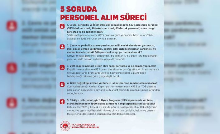 İklim değişikliği uzman yardımcısı alımı için Cumhurbaşkanlığı Kariyer Kapısı platformu üzerinden KPSS ve YDS puanına göre başvuruların yapılacağı, adayların 23 Aralık’ta gireceği sınavın ardından alınacak kişilerin belirleneceği ifade edildi. İŞKUR İşgücü Uyum Programı (İUP) kapsamında alınacak bin 500 kişinin 2025 yılı Ocak ayında göreve başlayacağı, Bakanlığın merkez ve taşra teşkilatındaki hizmet binalarının temizlik, bakım ve onarım faaliyetlerini destekleme kapsamında istihdam edileceği belirtildi.