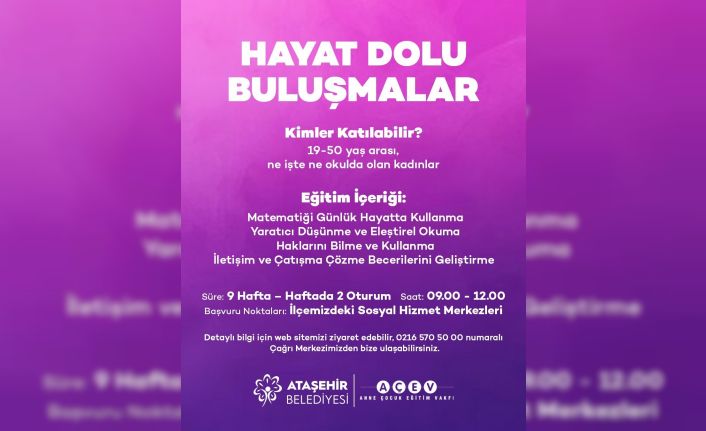 Ataşehir Belediyesi ve Anne Çocuk Eğitim Vakfı (AÇEV) kadınların güçlenmesi ve toplumsal eşitliğin sağlanması adına önemli bir projeye imza atıyor. "Hayat Dolu Buluşmalar" adlı güçlenme programı, 19-50 yaş arasındaki kadınlara yönelik olarak, katılımcıların eğitim, yaşam ve iş gücü becerilerini geliştirmeyi amaçlıyor.