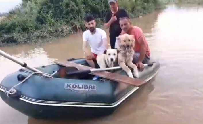 Düzce’de sağanak yağış sebebiyle taşan Efteni Gölü yakınlarındaki çiftlikte mahsur kalan köpekler, 3 gün sonra botla kurtarıldı. Köpekleri kurtaran Rotasızlar Off-Road Kulübü üyeleri, çiftlikte aç kalan hayvanları da besledi.