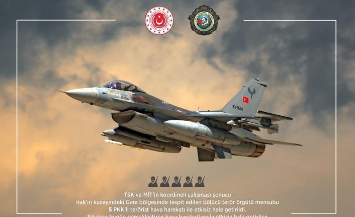 Irak’ın kuzeyi Gara Bölgesi’nde TSK ve MİT’in koordineli çalışması sonucunda 5 PKK’lı teröristin hava harekatıyla etkisiz hale getirildiği açıklandı.