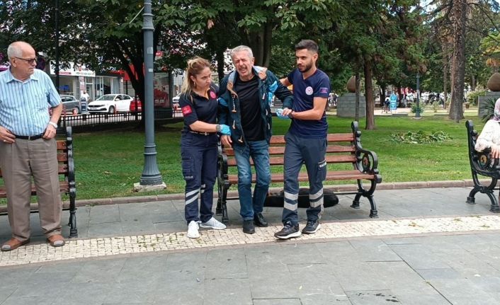 Ambulanstan inen sağlıkçı yaşlı adamın omzuna dokunarak, durumunu sordu. Daha sonra kalp krizi geçirdiği şüphelenilen yaşlı adamın koluna giren sağlıkçı, ambulansa yöneldi. Sağlıkçılar tarafından ambulansta ilk müdahalesi yapılan yaşlı adam, Gazi Devlet Hastanesi’ne kaldırıldı.