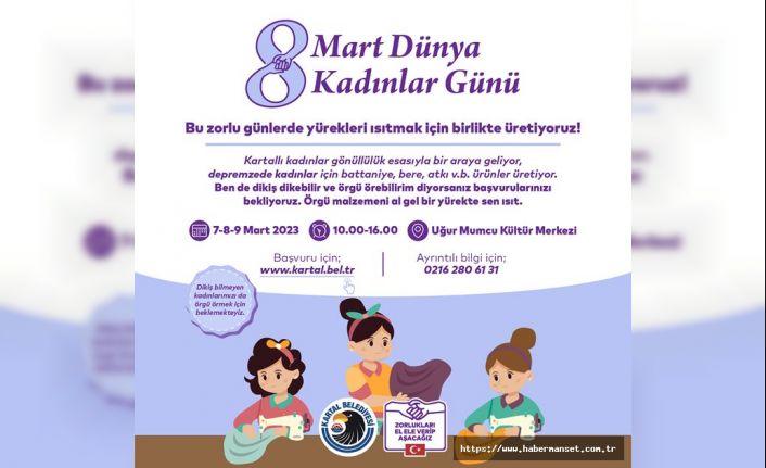 Kartal Belediyesi Kadın ve Aile Hizmetleri Müdürlüğü, 8 Mart Dünya Kadınlar Günü kapsamında anlamlı bir etkinlik düzenliyor. Gönüllülük esası ile bir araya gelen Kartallı kadınlar, depremzede kadınlara gönderilmek üzere; battaniye, bere, atkı vb. ürünler üretecek.