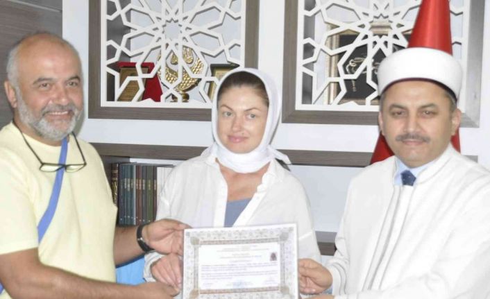Kelime-i Şehadet getiren ve Kur’an-ı Kerim dinleyen Yulia Konotopchyk, Hülya ismini alırken, ihtida belgesi de Fethiye Müftüsü Kamil Oktay tarafından kendisine sunuldu.