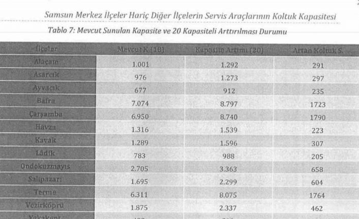 Böylece Alaçam, Asarcık, Ayvacık, Bafra, Çarşamba, Havza, Kavak, Ladik, 19 Mayıs, Salıpazarı, Terme, Vezirköprü ve Yakakent ilçelerinde 33 bin 75 kişilik öğrenci-personel taşıma kapasitesi 19 kapasiteli araca geçilirse 39 bin 546’ya, 20 kapasiteli geçerlerse de mevcut kapasiteden 8 bin 668 kişi artırılarak 41 bin 743 kişiye yükselecek.