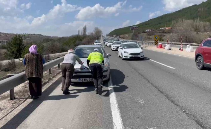 Ramazan Bayramı tatilinin dönüş yolunda aracı bozularak yolun ortasında kalan yaşlı çifte, trafik polisi aracı iterek ve çekici çağırarak yardım etti.