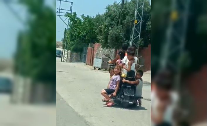 Hatay’ın Erzin ilçesinde çocuk sürücünün kullandığı elektrikli motosiklete 8 çocuğun bindiği anlar cep telefonu kamerasına yansıdı.