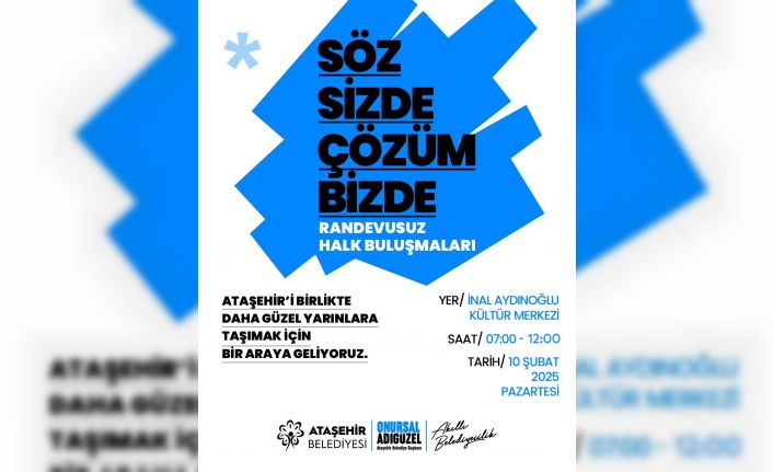 Ataşehir Belediyesi, vatandaşların görüş ve taleplerini dinleyerek ortak çözümler üretmek amacıyla "Söz Sizde, Çözüm Bizde" sloganıyla randevusuz halk buluşmaları düzenliyor. İlk buluşma, 10 Şubat Pazartesi günü saat 07.00’de İnal Aydınoğlu Kültür Merkezi’nde başlayacak ve saat 12.00’ye kadar sürecek. Ataşehir Belediye Başkanı Onursal Adıgüzel’in, başkan yardımcıları ve ilgili birim müdürleri ile tam kadro yer alacağı halk buluşmalarında vatandaşlarla bir araya gelinip talepler dinlenecek.