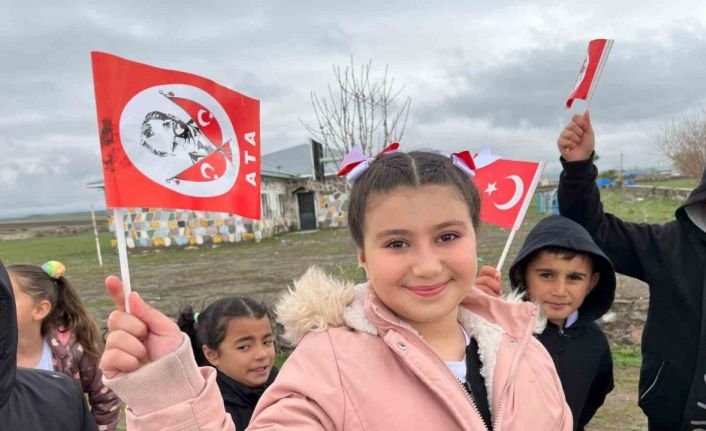 Kars’ta köy okulunda öğrenciler, Atatürk posteri, ve bayraklarla yürüyerek 23 Nisan Ulusal Egemenlik ve Çocuk Bayramı’nı kutladı.