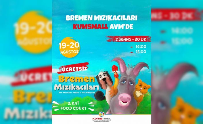 19-20 Ağustos tarihlerinde KUMSMALL AVM’de çocuklarla buluşacak olan Bremen Mızıkacıları’nın sevimli kahramanları eğlenceli gösterilerini iki seans halinde sunacaklar. Bremen Mızıkacıları gösterisi saat 14.00 ile 15.00’de başlayacak ve ücretsiz olarak izlenebilecek.