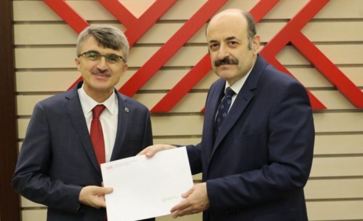 Mazbatayı DPÜ Rektörü Uysal’a veren, Yekta Saraç, yeni görevinde başarılar diledi.