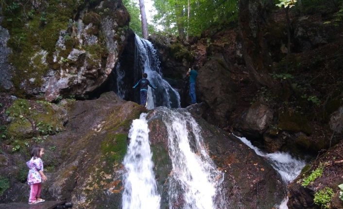 Yemyeşil doğasıyla ziyaretçilerine huzur veren bir mesire alanı olan Karapınar Mevkiinde, vatandaşlar, aileleriyle şelale yakınlarında yürüyüş yapabiliyor.