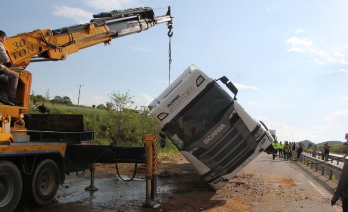 İhbar üzerine olay yerine polis, jandarma ve sağlık ekipleri sevk edildi. Ekiplerce yapılan incelemede, kazada yaralanan olmadığı belirlendi. Kaza nedeniyle İzmir-Ankara D300 karayolu, devrilen tırın kaldırılması çalışmaları süresince trafiğe kapatıldı. Uzun araç kuyruklarının oluştuğu yolda, ekiplerin yaklaşık bir saatlik çalışmasının ardından trafik akışı kontrollü şekilde yeniden sağlandı.