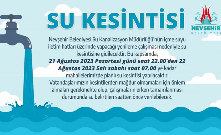 Konuyla ilgili olarak yapılan açıklamada; “Nevşehir Belediyesi Su Kanalizasyon Müdürlüğü’nün içme suyu iletim hatları üzerinde yapacağı yenileme çalışması nedeniyle su kesintisine gidilecektir. Bu kapsamda, 21 Ağustos 2023 Pazartesi günü saat 22.00’den 22 Ağustos 2023 Salı sabahı saat 07.00’ye kadar mahallelerimizde planlı su kesintisi yapılacaktır. Vatandaşlarımızın kesintilerden mağdur olmamaları için önlem almaları gerekmekte olup, çalışmaların erken tamamlanması durumunda su belirtilen saatten önce verilebilecek.” denildi.