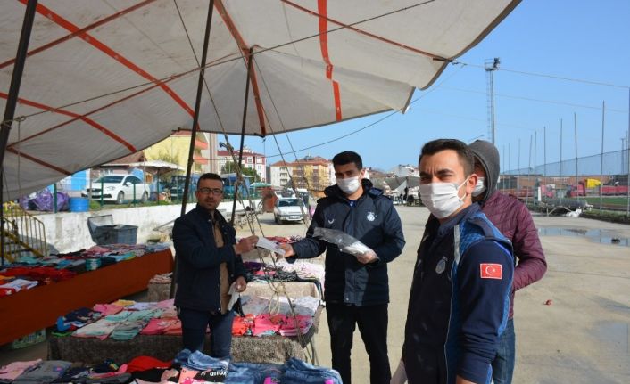 Vatandaşların temel gıda ihtiyaçlarını karşıladıkları ilçe pazarının giriş ve çıkış noktalarına dezenfektan standı yerleştiren belediye ekipleri, halkın eczane ve marketlerde bulmakta güçlük çektiği koruyucu maske ve eldivenleri hem pazar esnafı, hem de pazar yerine gelen vatandaşlara dağıttılar.