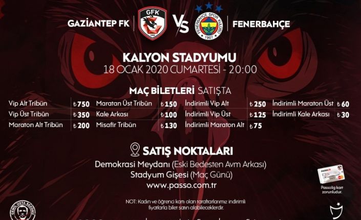 Süper Lig’in 18. haftasında oynanacak Gaziantep FK-Fenerbahçe maçının bilet satışları devam ediyor.