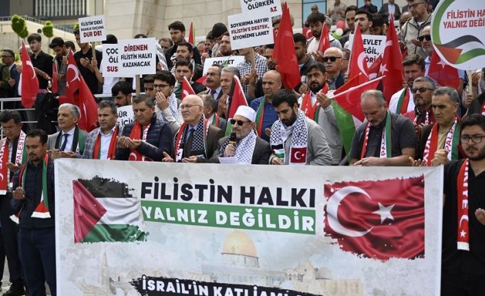 Basın açıklaması sonrasında Filistin’de yaşamını kaybedenler için dua edildi ve hayır lokması dağıtıldı.