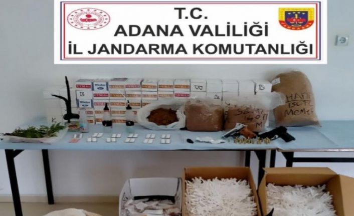 Adana İl Jandarma Komutanlığı ekipleri, merkez Yüreğir ilçesi Yunusoğlu Mahallesinde ikamet eden bazı şahısların evlerinde uyuşturucu madde ve silah bulundurduğu bilgisi üzerine çalışma başlattı. Şahısların evlerinde yapılan aramada, 122 adet sentetik hap, 10 gram metamfetamin 12 adet kenevir bitkisi, 7 adet uyuşturucu kullanma aparatı, 35 bin 920 adet makaron, 10 kilo 800 gram kıyılmış tütün, 2 adet ruhsatsız tabanca, 3 adet tabanca şarjörü ve 32 adet tabanca mermisi ele geçirildi.