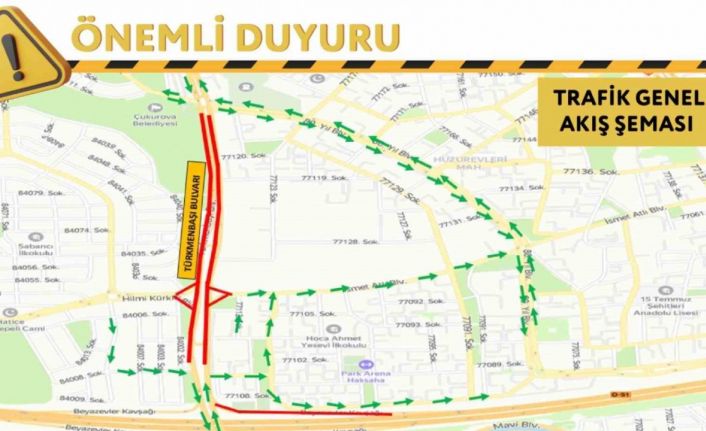 Büyükşehir belediyesinden konuyla ilgili yapılan açıklamada, “Türkmenbaşı alt geçit çalışmasından dolayı bugün (6 Ağustos Pazar) saat 17.00’den itibaren Türkmenbaşı Bulvarı’nın 77110 sokak kesişiminden, 80. Yıl Bulvarı kesişimine kadarki yol trafiğe kapatılacaktır. Trafik akışı ekteki krokide gösterildiği gibi alternatif güzergahlardan sağlanacaktır” denildi.