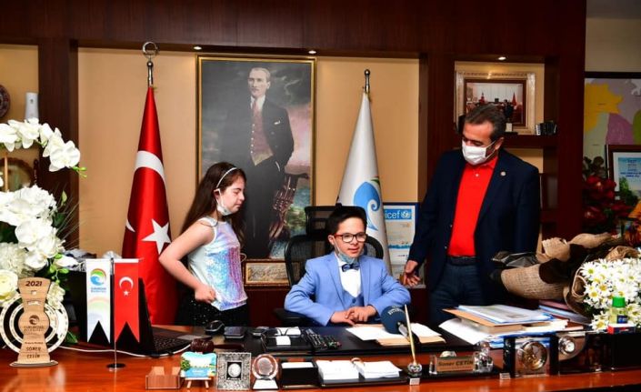 Başkan Soner Çetin’in koltuğuna Başkan olarak Mehmet Çağlar Pekar (12) ve Başkan Yardımcısı olarak da Selinnaz Özcan (12) oturdu. Soner Çetin’in koltuğunu devrettiği özel çocuklar yeni spor alanları ile basketbol ve yüzme kursları açılmasını ilk talimat olarak verdi.