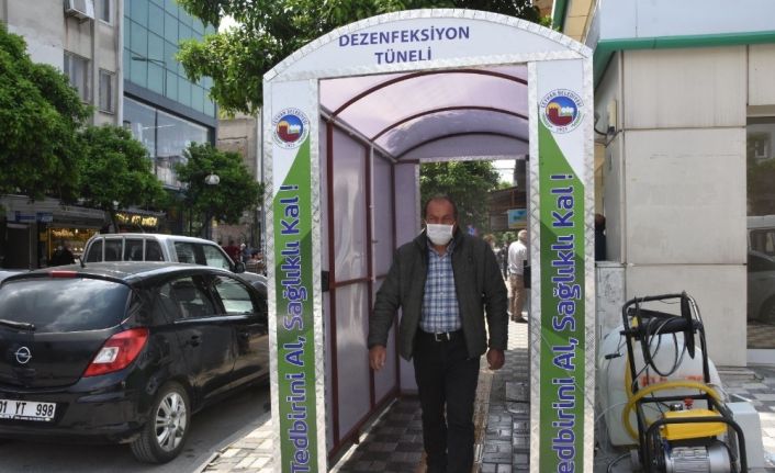 Ceyhan Belediyesi korona virüs salgını ile mücadele kapsamında kentin çeşitli noktalarına dezenfekte tüneli kuruyor.