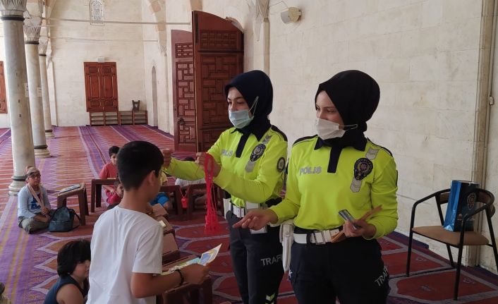 Adana’da polis Trafik Dedektifleri Projesi kapsamında kuran kursuna gelen çocuklara temel trafik eğitimi verdi.