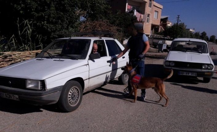 Uygulamada Adana İl Jandarma Komutanlığı ekipleri eğitimli narkotik köpeklerle araç kontrolünde denetimlere katıldı.