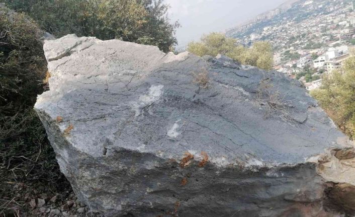 Ağaç kökünün bulunduğu alandan koptuğu tespit edilen kaya parçası için zabıta ve polis ekipleri inceleme yaptı.