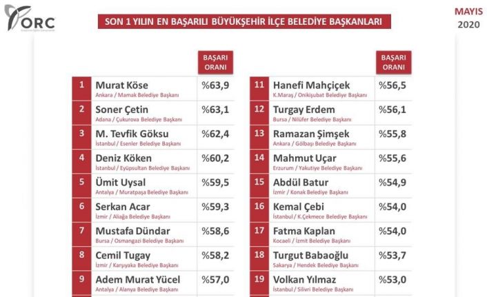 ORC Araştırma Şirketi çalışmasını büyükşehir belediye sınırları içerisinde bulunan ilçe belediye başkanlarını kapsayacak şekilde yaptı. Anket sonuçlarına göre Başkan Soner Çetin yüzde 63,1 oranla Türkiye’nin en başarılı ikinci belediye başkanı olarak belirlendi. İlk sırayı yüzde 63,9 oranla Ankara Mamak Belediye Başkanı Murat Köse aldı.