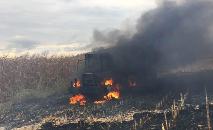 Tarlada mısır hasadında yanan traktör kullanılamaz hale geldi