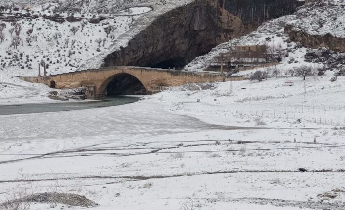 Adıyaman’da ki 2 bin yıllık tek kemerli tarihi Cendere Köprüsü, kar yağışıyla bir başka güzel görünüyor.
