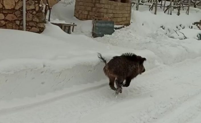 Adıyaman’ın Çelikhan ilçesinde kar yağışından dolayı aç kalan yaban domuzları ilçe merkezine indi.