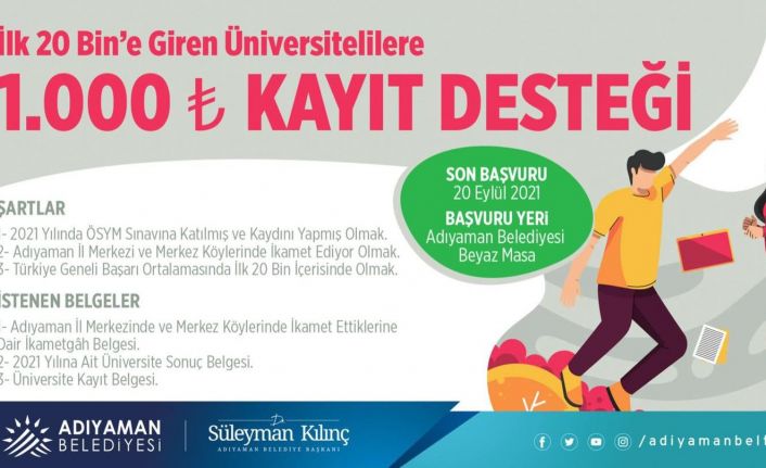 Adıyaman Belediyesi, bu yıl üniversite sınavında ilk 20 bine giren Adıyaman merkez ilçe ve merkeze bağlı köylerde ikamet eden öğrencilere bin TL kayıt desteğinde bulunacak.