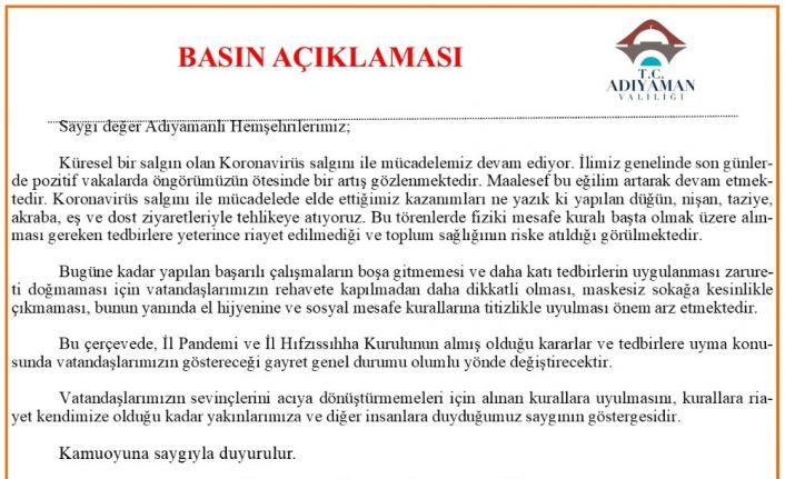 Adıyaman’da, korona virüs (Covid-19) pozitif vakalarında son günlerde artış yaşandığının vurgulandığı Adıyaman Valiliğince yapılan yazılı açıklamada, “Küresel bir salgın olan korona virüs salgını ile mücadelemiz devam ediyor. Ilimiz genelinde son günlerde pozitif vakalarda öngörümüzün ötesinde bir artış gözlenmektedir. Maalesef bu eğilim artarak devam etmektedir. Korona virüs salgını ile mücadelede elde ettiğimiz kazanımları ne yazık ki yapılan düğün, nişan, taziye, akraba, eş ve dost ziyaretleriyle tehlikeye atıyoruz. Bu törenlerde fiziki mesafe kuralları başta olmak üzere alınması gereken tedbirlere yeterince riayet edilmediği ve toplum sağlığının riske atıldığı görülmektedir. Bugüne kadar yapılan başarılı çalışmaların boşa gitmemesi ve daha katı tedbirlerin uygulanması zarureti doğmaması için vatandaşlarımızın rehavete kapılmadan daha dikkatli olması, maskesiz sokağa kesinlikle çıkmaması, bunun yanında el hijyenine ve sosyal mesafe kurallarına titizlikle uyulması önem arz etmektedir. Bu çerçevede, il pandemi ve il hıfzıssıhha kurulunun almış olduğu kararlar ve tedbirlere uyma konusunda vatandaşlarımızın göstereceği gayret genel durumu olumlu yönde değiştirecektir. Vatandaşlarımızın sevinçlerinin acıya dönüştürmemesi için alınan kurallara uyulmasını, kurallara riayet kendimize olduğu kadar yakınlarımıza ve diğer insanlara duyduğumuz saygının göstergesidir" ifadelerine yer verildi.