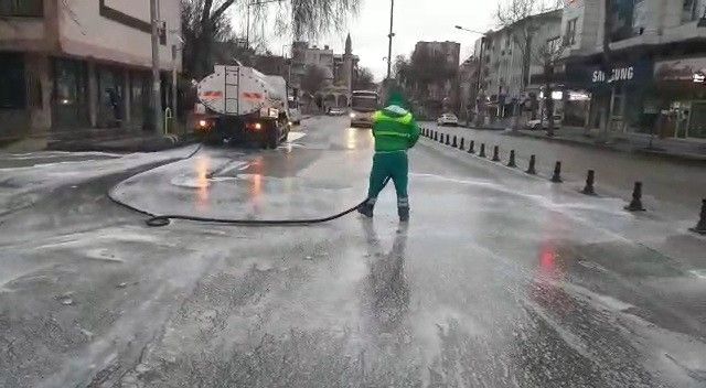 Adıyaman’da cadde ve sokaklar korona virüsüne karşı köpüklü suyla yıkanıyor.