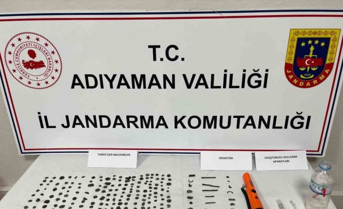 Adıyaman İl Jandarma Komutanlığı ekipleri, tarihi eser kaçakçılığına yönelik operasyon yaptı. Operasyon çerçevesinde, A.A. isimli şahsın tarihi eser kaçakçılığı yaptığı tespit edilmesi üzerine şahsın adreslerine baskın yapıldı. Adreslerde yapılan aramalarda 306 adet sikke, 43 adet obje, 1 adet dedektör, 2 adet payp ve 1 adet pet şişe düzeneğinde uyuşturucu kullanma aparatı ele geçirildi. Tarihi eserler muhafaza altına alınırken A.A. ise gözaltına alındı.