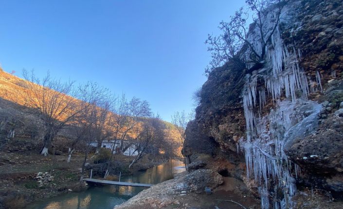 Adıyaman’da, havaların soğumasıyla birlikte kayalıklardan akan sular buz tuttu.